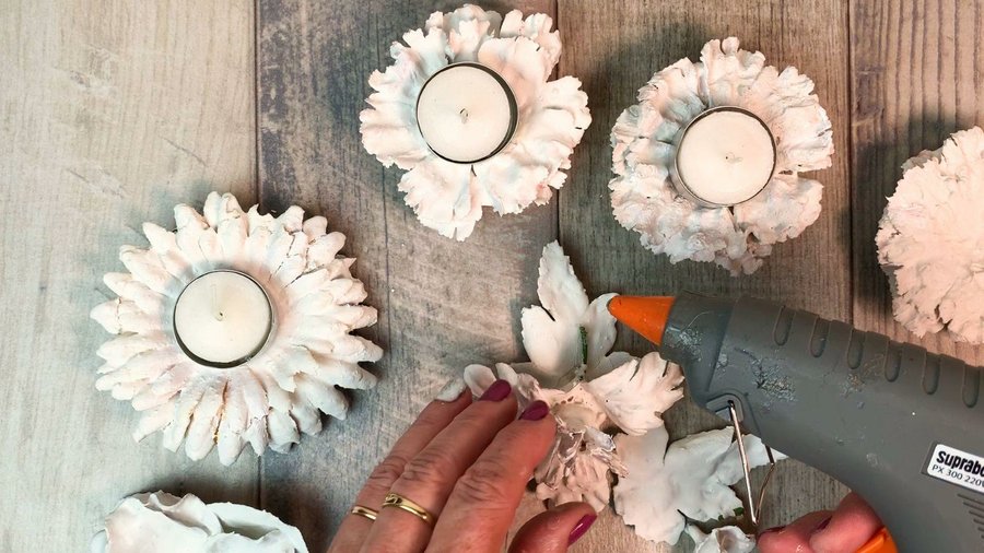 Para pegarla empleo la pistola de silicona caliente y con la misma también le pego la base del portavelas, así en todas las flores . Si en alguna se ve el color de base se lo puede disimular con pintura acrílica.