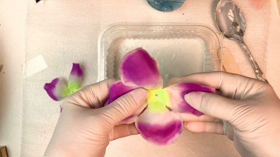 También podemos endurecer las hojas con la misma mezcla , flores más pequeñas algunas desarmadas otras enteras .