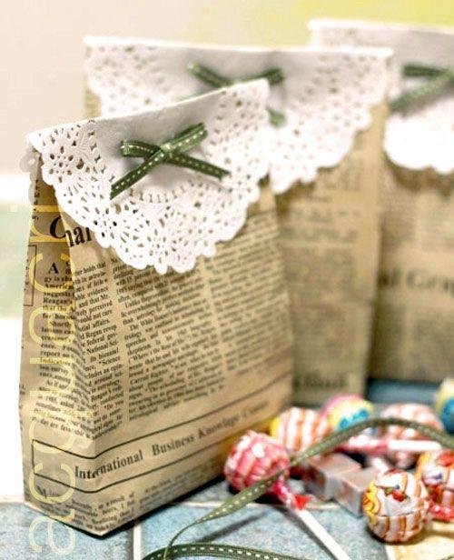 Empaque de regalo : Con hojas de periódico puedes hacer bolsas de regalo , como ves el detalle es añadir una blonda con una cinta , se ve precioso y muy vintage .