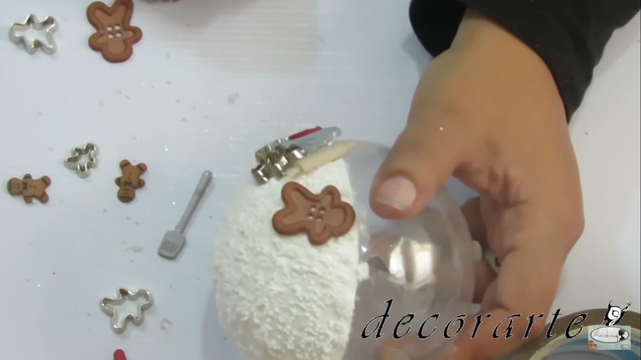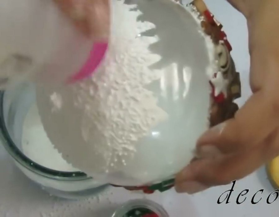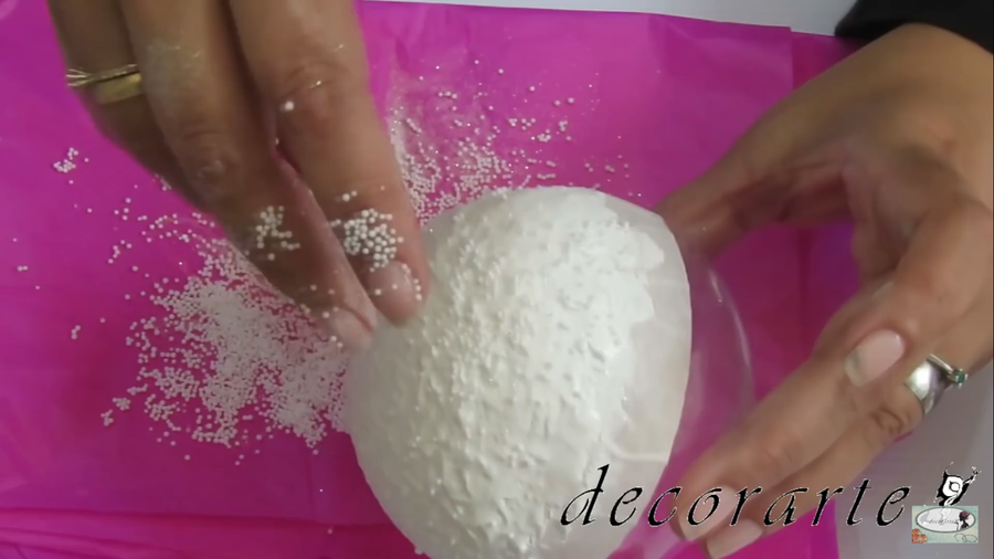 Le aplicaremos encima pegamento blanco, y le esparciremos bolitas de telgopor, y escarcha