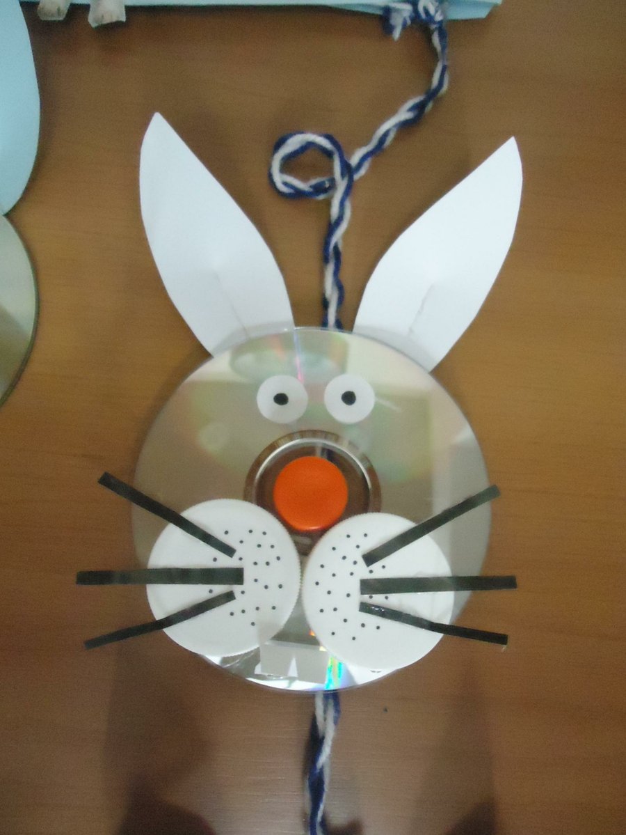 EL conejo se elaboró con un CD de color más claro, y las mejillas se hicieron con 2 tapas blancas idénticas. La nariz tambien es una tapa color anarajnda, y las orejas se hicieron con cartulina reciclada.