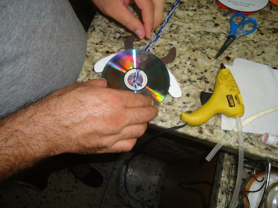 Observese que está oculto donde se pegó la trenza (lana tejida o enrollada) al CD de la parte del frente, con otro CD.