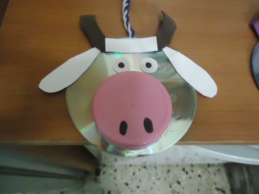 La vaca, con una trompita hecha con una tapa grande color rosada, Los cachos son de foami marrón y las orejas son de cartulina reciclada.