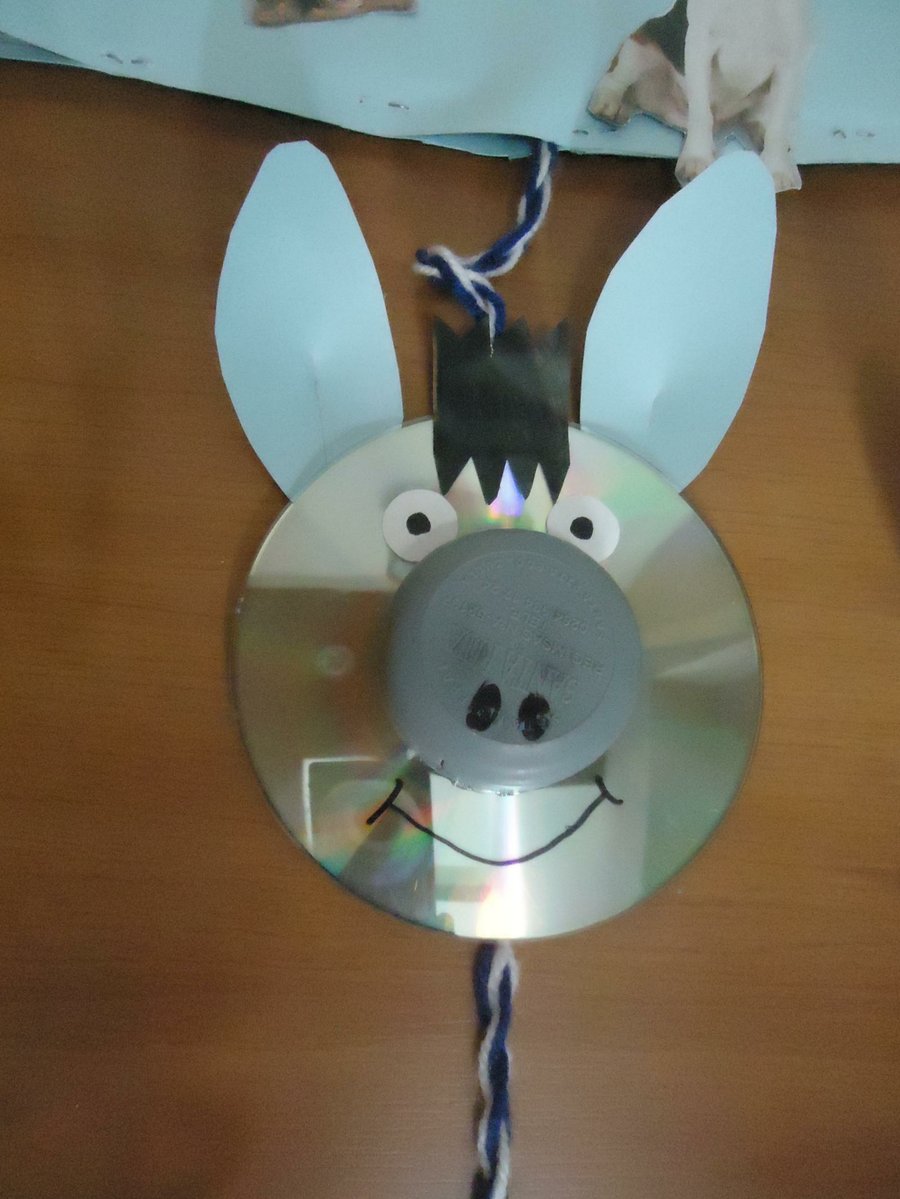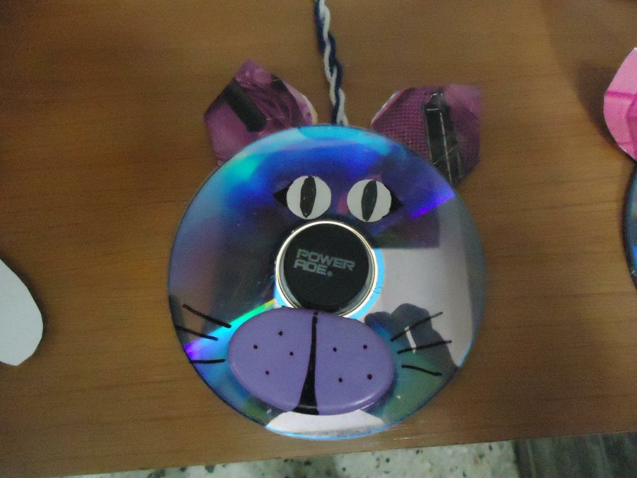 La simpática gatica se hizo con un CD de tonalidad más morada, se colocó una tapa de shampúm y las orejas se hicieron con revistas, cuadrando los colores a convenir. Los orificios de la nariz se pintaron con marcador para acetato (permanente).