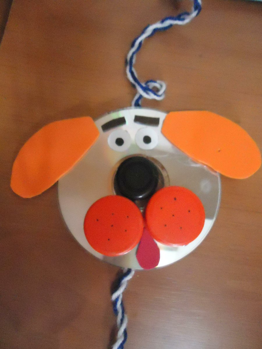 EL perrito con orejas, lengua y cejas de foami. Nariz y mejillas con tapas de plastico, con colores a juego.