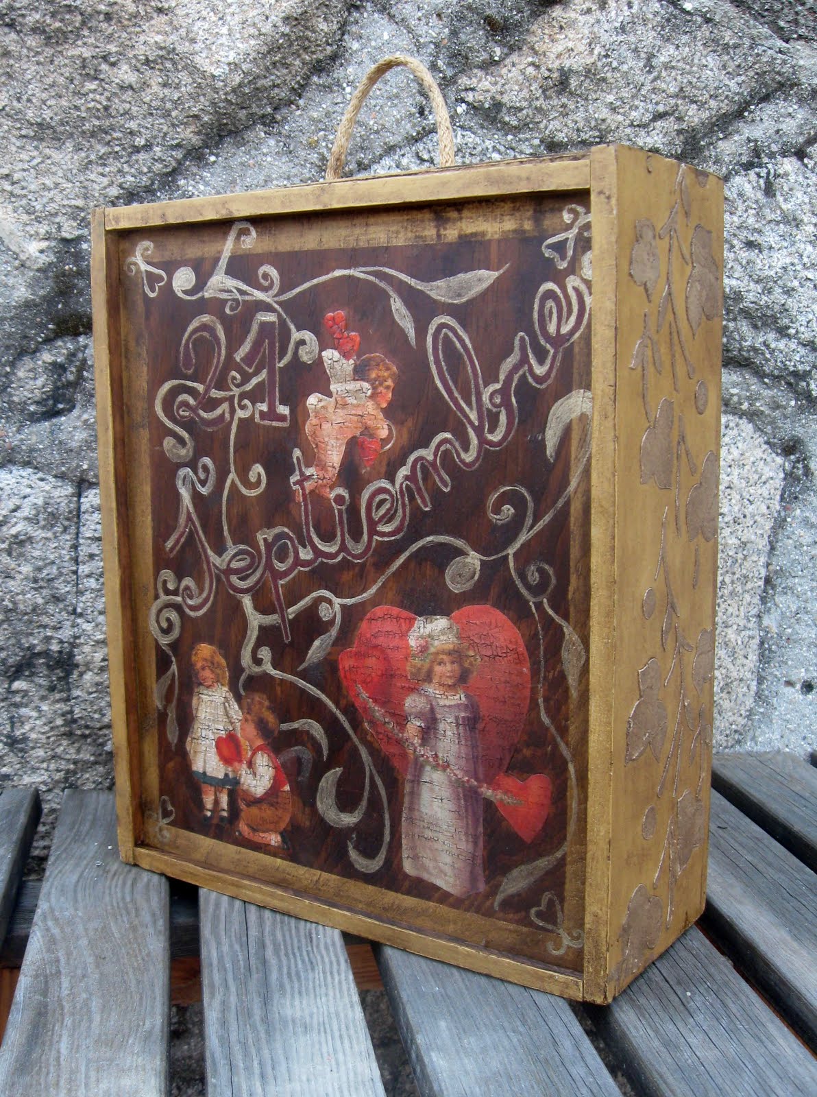 En este ejemplo además pegan diversos elementos a la tapa y usan una plantilla para reciclar una caja de vinos y transformarla en un consturero.