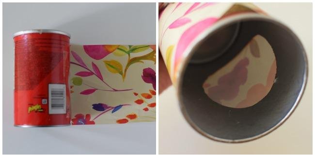 2. Cortamos el papel estampado del ancho y circunferencia del envase; yo lo he cortado de 11,4 x 25 cms.