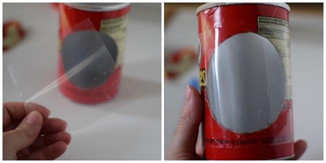 4. Cortar un trozo de acetato del tamaño de la abertura dejando margen por donde lo pegaremos al envase. En este caso, he usado silicona fría para pegarlo al envase.