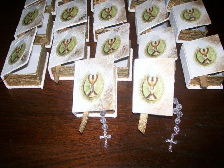 Estas cajitas imitan a la perfección los libritos de Primera Comunión, gracias a la habilidad de Angee. Los materiales que ha empleado son cartón, cola blanca, papel de cocina, cinta dorada y papel crepe dorado. La imagen para decorar la tapa la buscó en Internet. Después de hacer con cartón las dos partes del libro, es decir, la caja y la tapa, se adorna con textura mediante papel de servilleta, simulando las hojas en el canto, y ya sólo falta poner la cinta y completar la tapa con el rótulo y una imagen pegada.