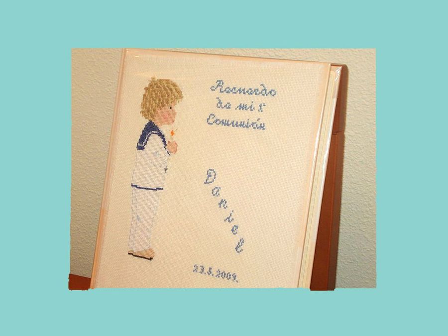 No negaremos que a nosotras también nos ilusiona preparar esos detalles, imaginando la cara que pondrán nuestros hijos. El recordatorio más apropiado es un álbum donde plasmar las vivencias del día. Podemos confeccionarlo en el típico papel vegetal, con puntadas de hilo, forrándolo en tela o en un maravilloso papel especial que hayamos escogido. ¡Hay muchas opciones! Dalugado encontró que el librito de Primera Comunión de su niño era un poco insípido, de modo que lo adornó con gran acierto mediante el bordado en punto de cruz.
