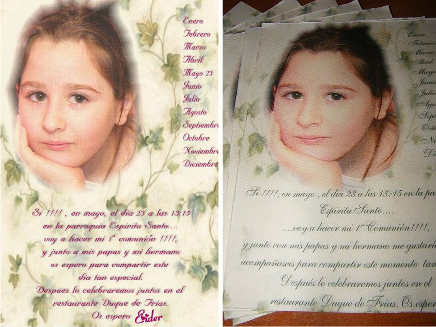 Jaiko es una enamorada del papel, material al que saca maravilloso partido en las técnicas más diversas. Naturalmente, cuando llegó la Primera Comunión de su niña, la encantadora Eider, nuestra forera decidió realizar las estampas de invitación. Acostumbrada a hacer las felicitaciones navideñas con fotos de sus hijos, preparó una bella maquetación con la imagen de la pequeña sobre un fondo bonito, y el texto en bella caligrafía. “Es simplemente añadir elementos como un fondo que te guste, el texto, la foto, a partir de ahí es la imaginación”, afirma Jaiko. ¡Un precioso colofón para este delicado conjunto de regalos!