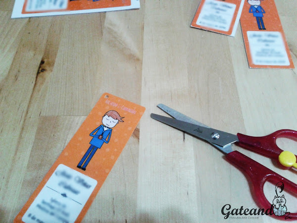 Estos marcapáginas se pueden editar, o escribir la información a mano una vez impresos. Yo me decanté por editarlos con Photoshop, poniendo la información básica: nombre, lugar de celebración y fecha. Hice dos modelos, unos pequeñitos con una bolsita de chucherías para los niños, y otros más grandes con una bolsita de bombones para los adultos.