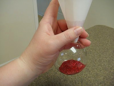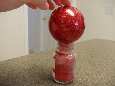 agregas el pegamento para glitter a la bola transparente,, sacas el excedente, luego le echas el glitter lo esparces bien por toda la esfera, dejas secar y luego saca el que no se haya pegado listo se ven preciosas.
