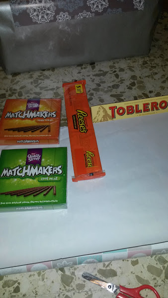 Para el gusto, le compré unas barritas de chocolate con menta, que a las dos nos encantan. Lo envolví con el mismo papel y para darle una pista del sentido, añadí con celo un chupa-chups de fresa.