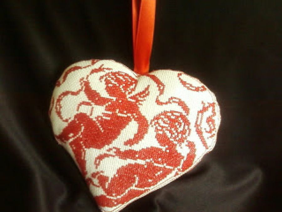 La usuaria Crucex ha realizado este corazón, al cual le ha colocado un lazo para poder llevarlo colgado. Fue hecho con motivo de un intercambio, elaborado con dos telas, la suya y la de la otra persona. Ambas caras muestran dibujos diferentes, como estos simpáticos ángeles o las cenefas.