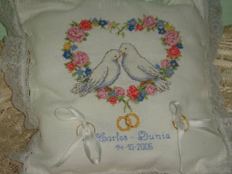 La amiga Ddp nos muestra este fantástico cojín elaborado para una boda, como objeto donde portar los anillos. Muestra la fecha del destacado evento, junto con los anillos y dos palomas blancas envueltas en un corazón de flores. Como adornos le ha añadido unos cuantos lazos a juego.