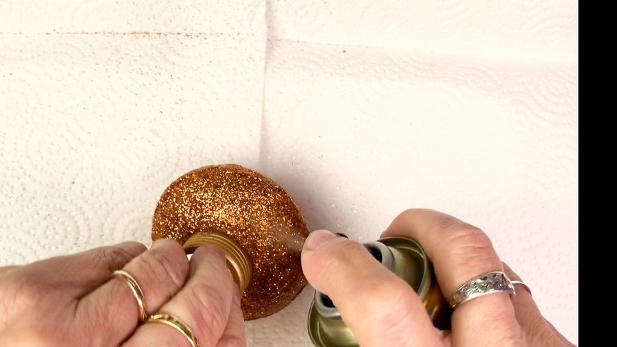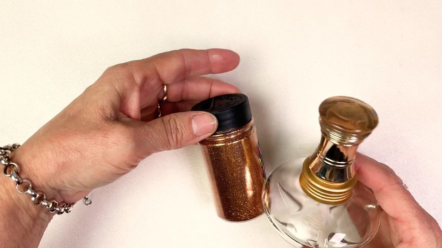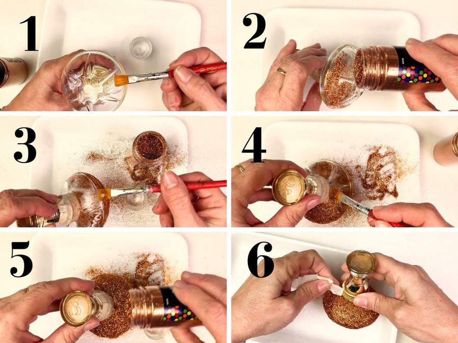 Decido cubrir la parte inferior del frasco con gibre o purpurina de color cobre pero antes protejo con cinta de papel aquellas zonas donde no quiero colocar el brillo.