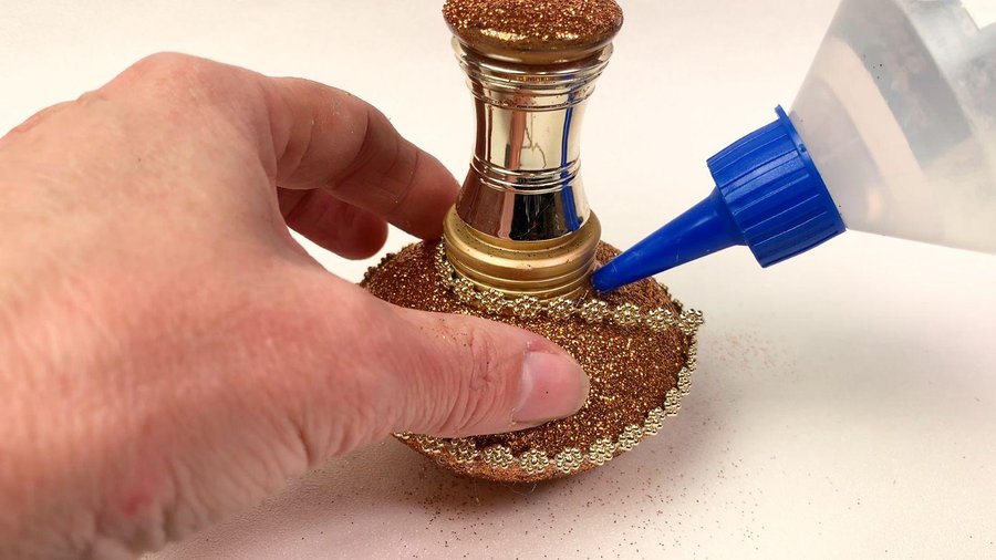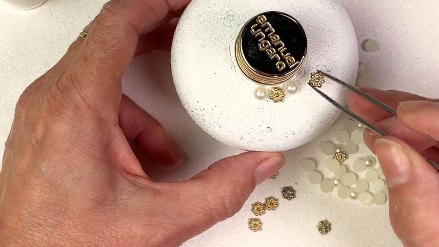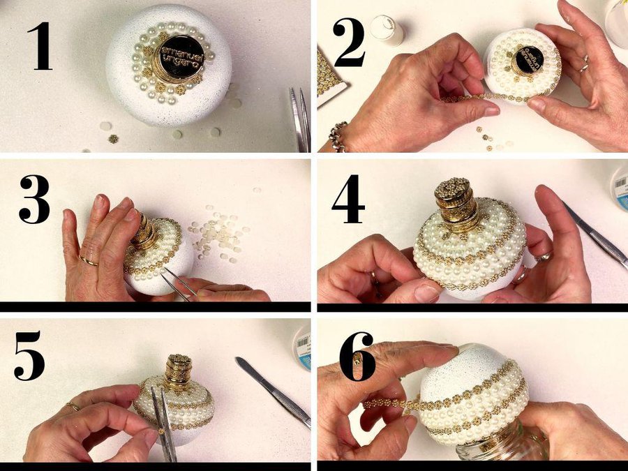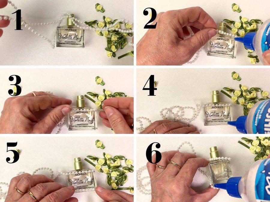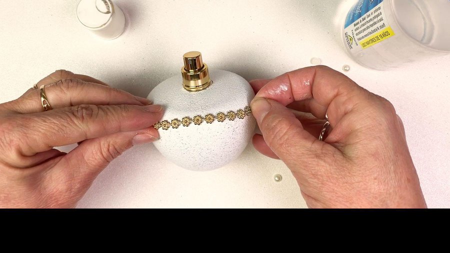 Comienzo pegando con silicona una tira de perlas de plástico en los bordes superior e inferior del frasquito. Voy girando la tira alrededor pero antes dejo secar para que no se mueva lo que pegué anteriormente.