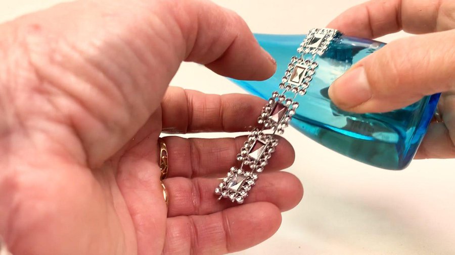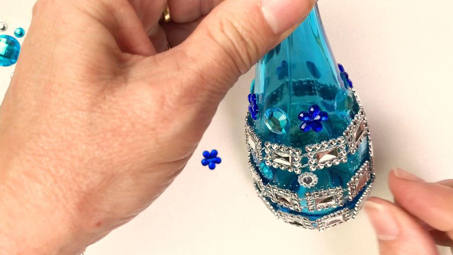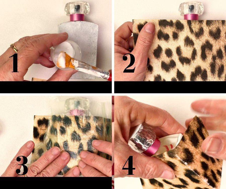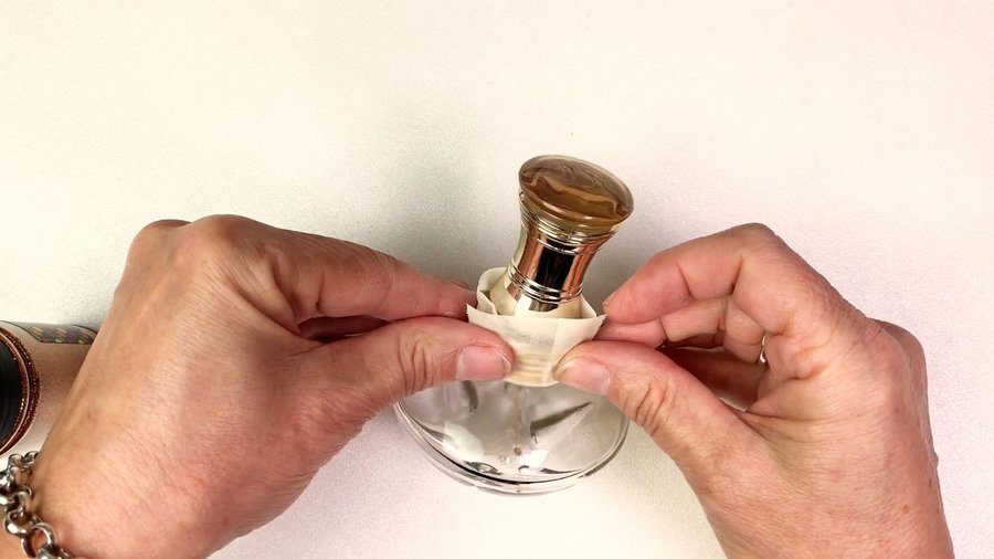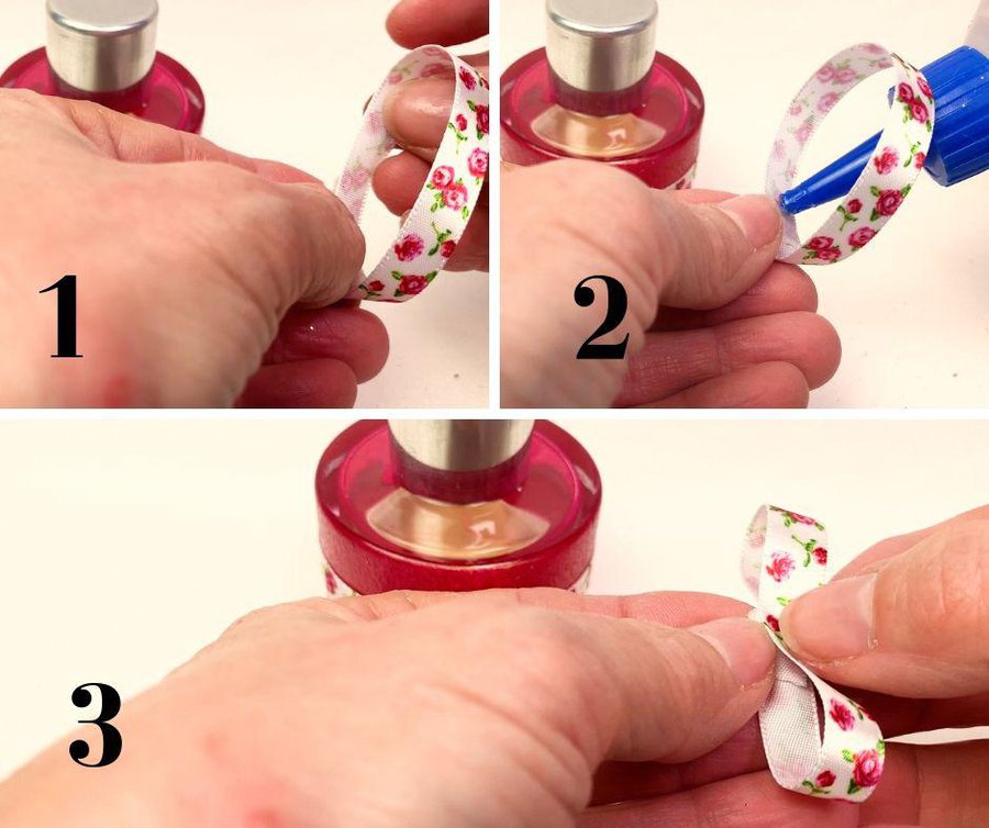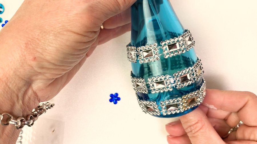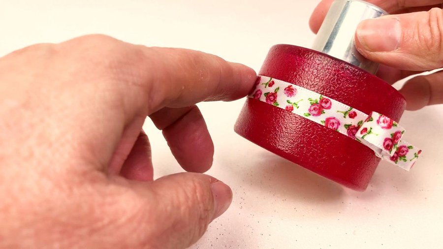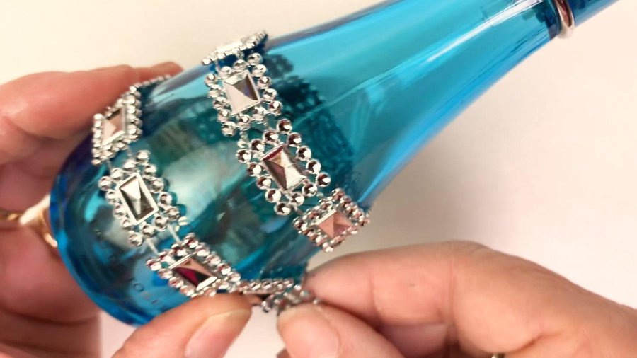 Para pegarla coloco silicona en cada pieza y luego rodeo con la tira el frasco pegándola y moviéndola para que me quede pareja.