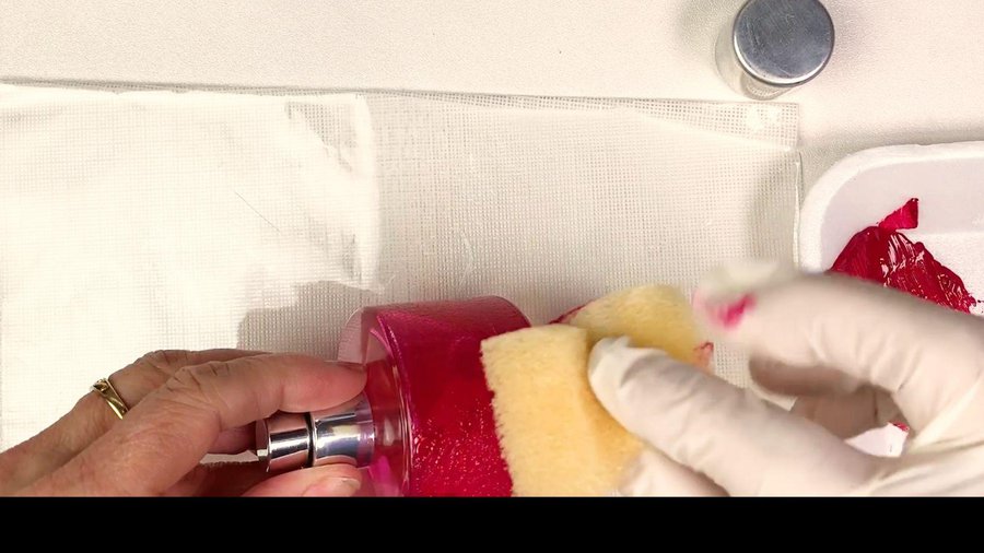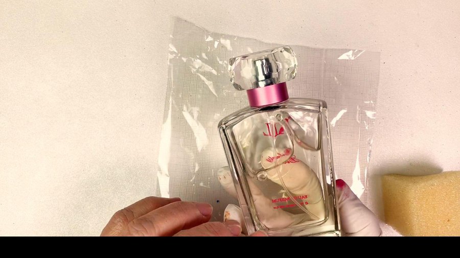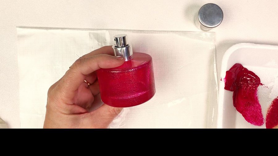 A este frasco que aún contiene perfume le di una mano de pintura acrílica fucsia solo en el lateral y ahora que esta mano se seco le daré una segunda para cubrir mejor.