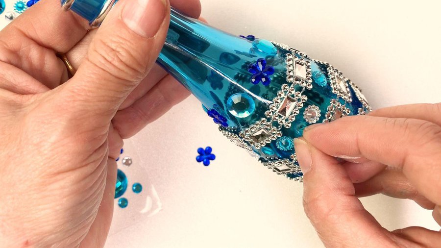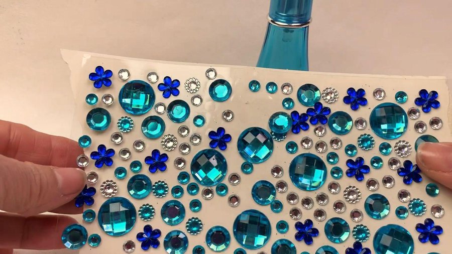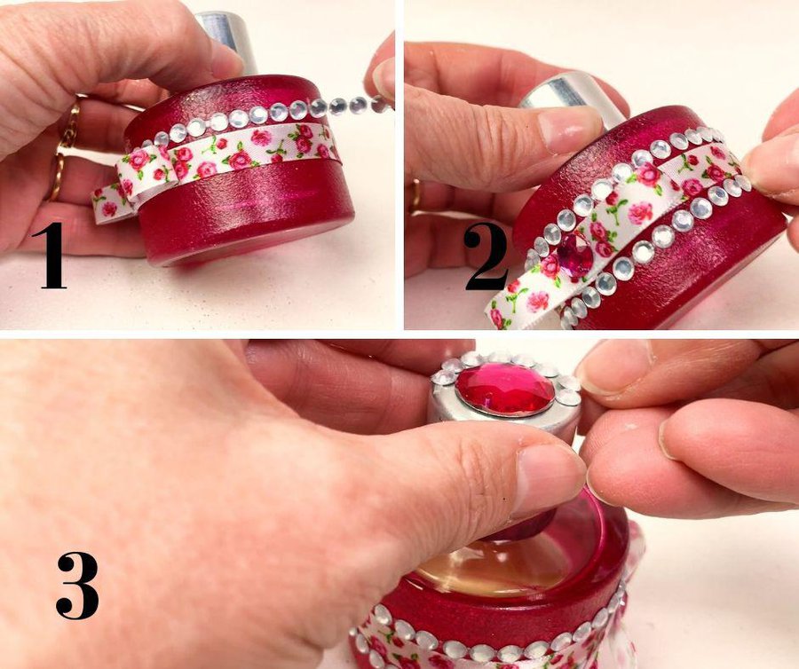 Con autoadhesivos que parecen estrás decoro alrededor de la cinta por encima y por debajo y también alrededor del acrílico fucsia de la tapa.