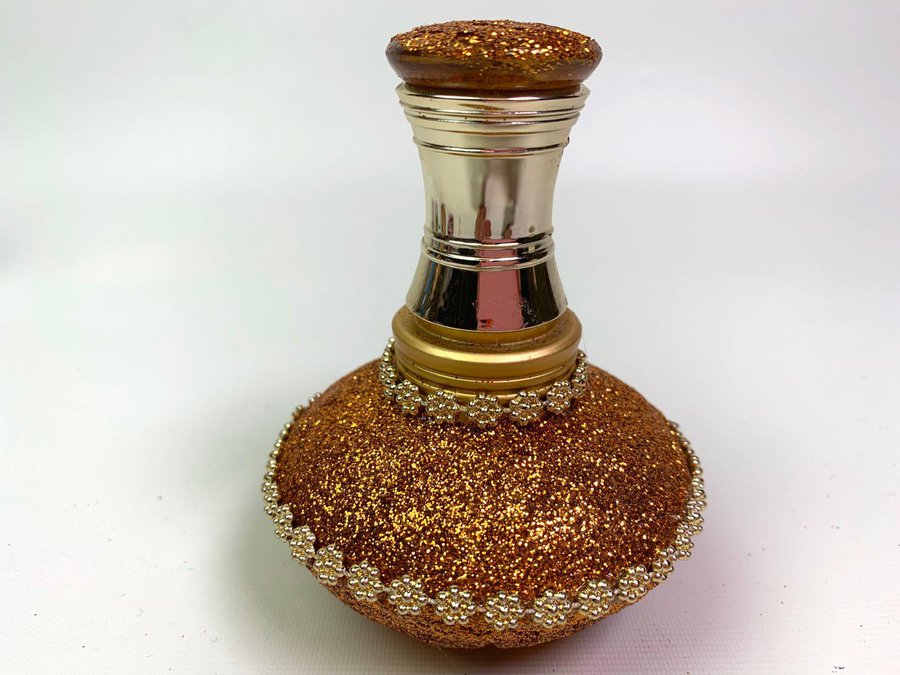 Como terminación le pegué con pegamento de silicona, en la parte que sobresale del frasco y en el cuello una tira de plástico dorada, esta tira tiene forma de florecitas.