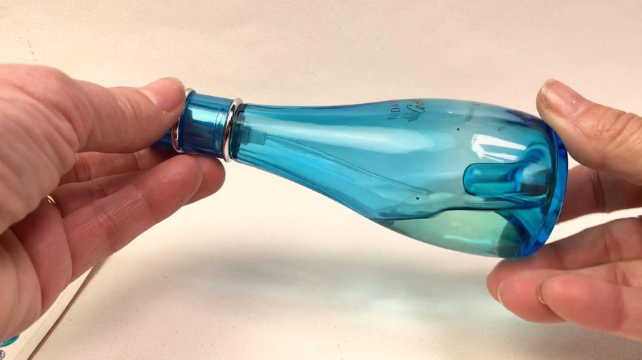 Este frasco tiene un hermoso color celeste y una forma estilizada.