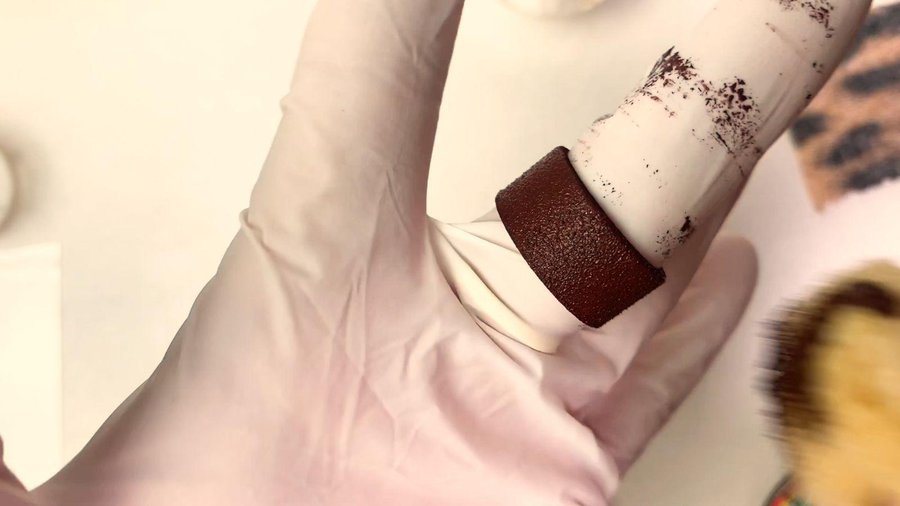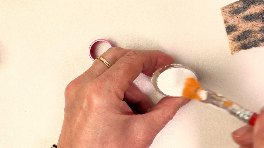Pinto de color chocolate el anillo que se une a ésta ya que el color rosa que tiene no combina con el resto. Utilizo pintura acrílico.