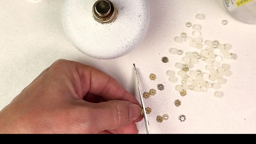 Cuando termino la parte superior lo doy vuelta y sigo pegando perlas y flores hasta cubrirlo totalmente. Si ustedes no quieren pintarlo de blanco pueden pegar las perlas directamente sobre el vidrio.