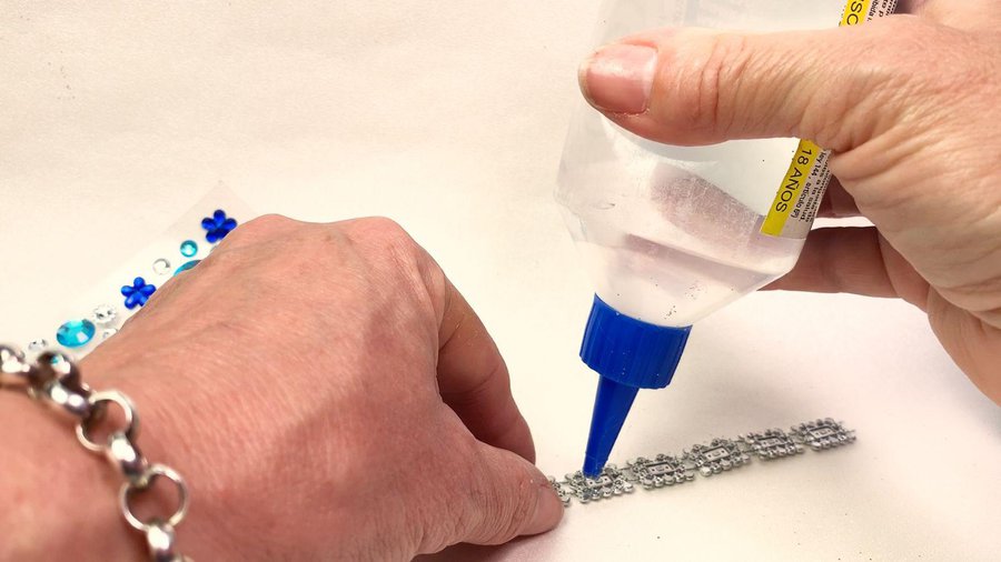 El pegamento puede ser silicona o pegamento universal. Las otras vueltas las hice con perlas solas y cada 2 vueltas pegue una tira entera de florecitas de plástico.