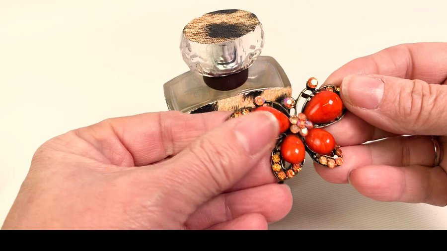 Cuando éste se seca le pego con silicona caliente en el centro una mariposa que perteneció a un prendedor.