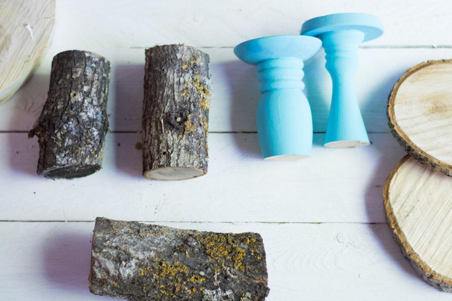 Materiales: Rodajas de árbol, troncos, pistola de silicona, sierra, lija, portavelas