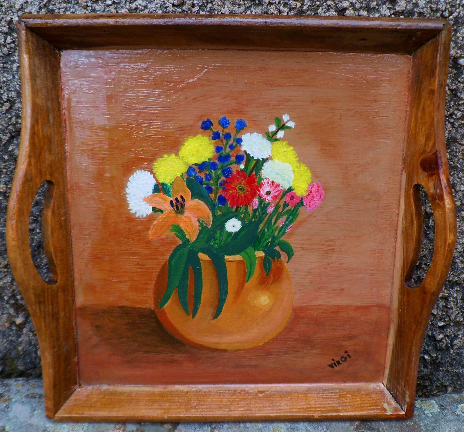 3.Ahora la pintaremos, en mi caso he utilizado pintura acrílica y he elegido como motivo un ramo de flores. Si no te atreves a pintarla sin ayuda puedes utilizar plantillas o simplemente pintarla con un color uniforme que te guste.