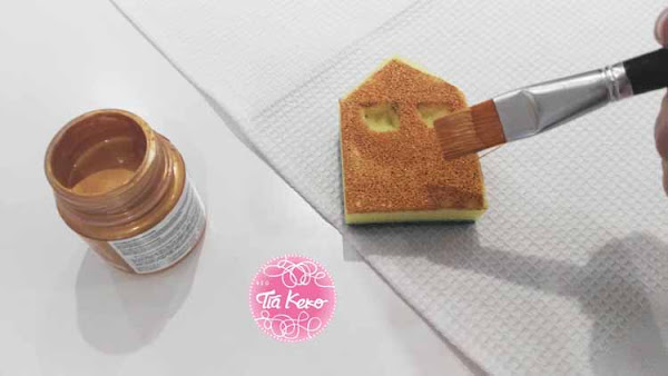 Con un pincel damos pintura dorada por toda la esponja con forma de casa y luego, con cuidado, la aplastamos contra el paño para que la pintura dibuje la casa en el paño.