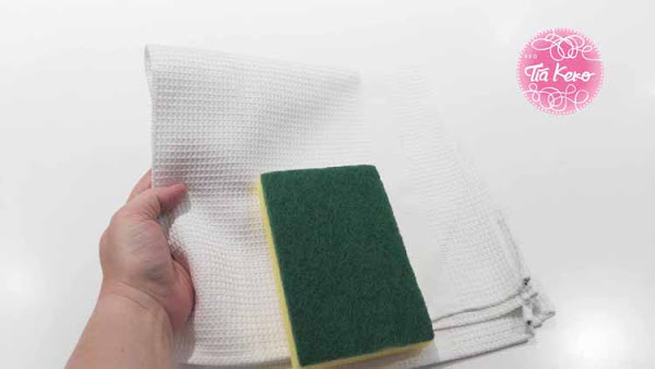 Lo primero que debemos hacer es darle forma a la esponja para poder decorar con color el paño de cocina.