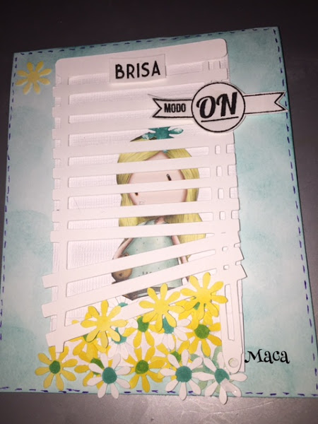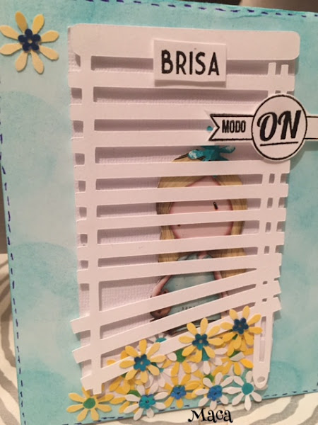 realice en la base un fondo de azul con una tinta distres, en una cartulina blanca , entinte con distress amarillo y corte unas florecitas, a las que les puse una lentejuela en forma de flor en el centro, las flores son como la jardinera de la ventana, una persiana que diseñe en la cameo, detrás una gorjuss tomando el fresco,