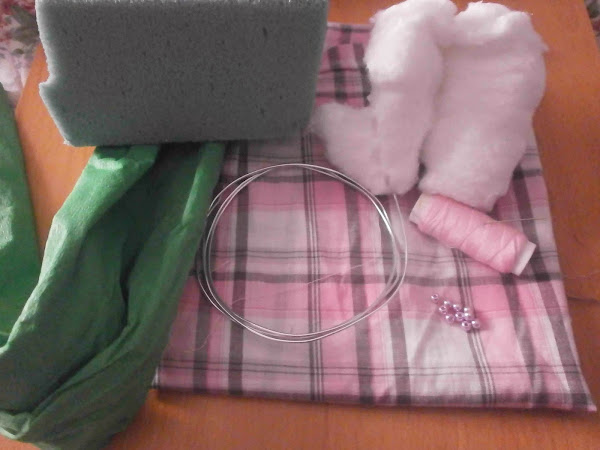 Tela, esponja para arreglos florales, algodón, alambre, hilo, aguja, unos abalorios, papel crespón verde.