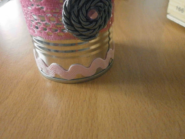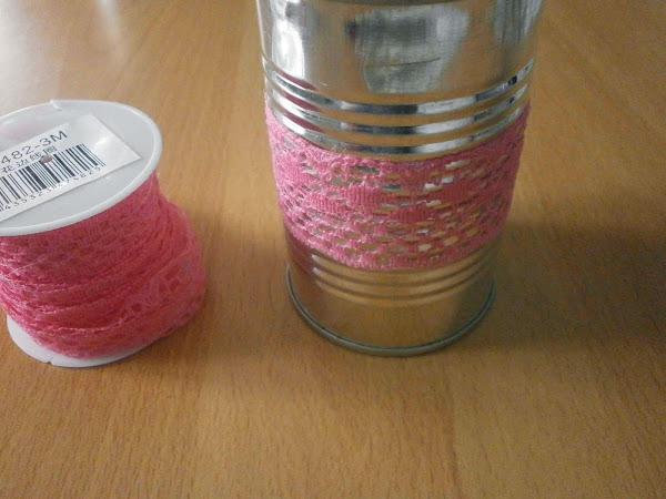 Empecé decorando las latas. Primero le puse una tira de puntilla pegándolo por detrás con dos o tres gotas de silicona.