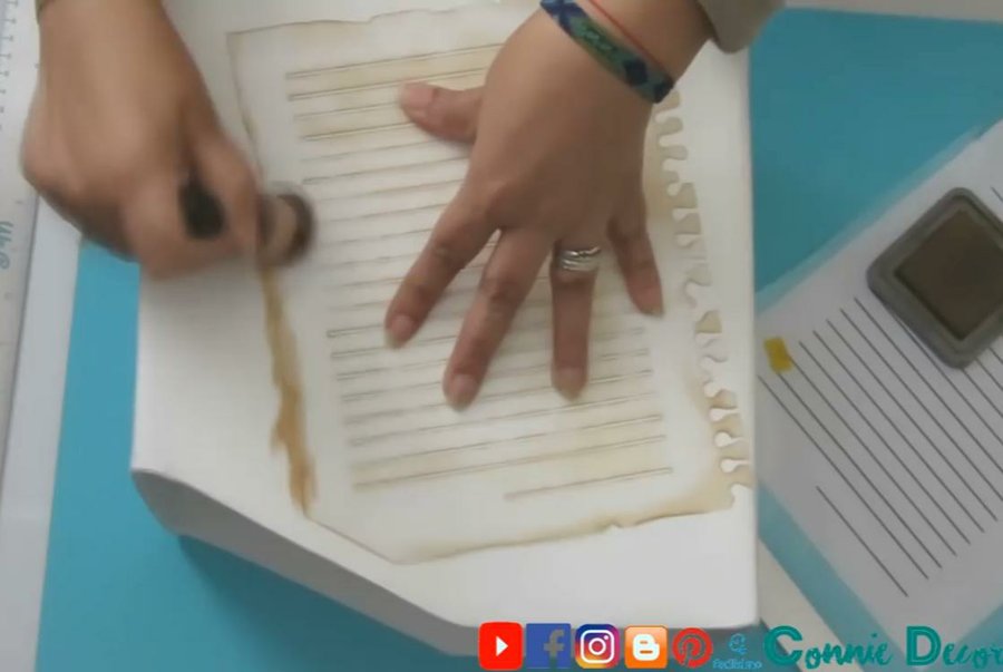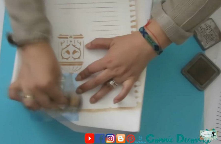 Pondremos un stencil de jaula en la mitad de la hoja, y decoramos con sellos vintage alrededor.