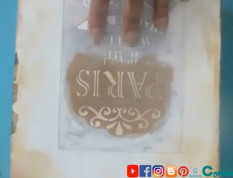 En la parte de atrás de la caja usaremos un stencil de París o el que tengas en casa,