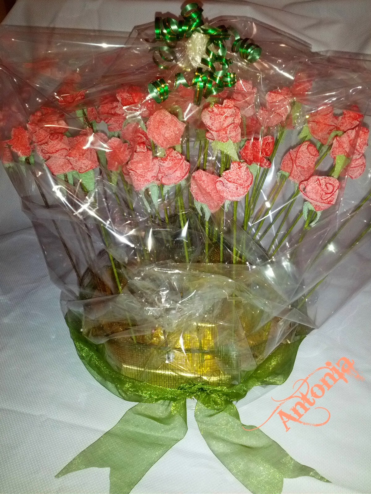 Anoche celebramos el cumpleaños de mi padre en un restaurante andaluz que nos gusta mucho. Preparé estas cosas para decorar la mesa. Un árbol de gominolas para los niños, del que no quedaron ni los palillos y dos centros de flores con Lisanthus beige y claveles lilas y rosas. Como siempre las fotos de las flores no hacen justicia, ni los colores ni como quedaron en realidad.Así se quedó la mesa.