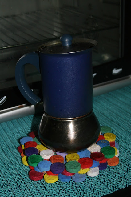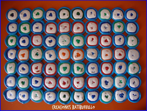 - Nuestro salvamanteles podría quedar como vimos en la foto anterior, pero a mi me parecía muy "soso", así que decidí pintarlo con témpera y mucho color. Mi idea principal no era pintarlo, simplemente quería aprovechar los corchos que teníamos en casa. Por eso tuve algunos problemas a la hora de conseguir un bonito resultado, ya que primero pinté las piezas de fuera y se veían los huecos sin pintar de la capa de abajo. Entonces decidí intentar rellenarlos de color con un pincel muy fino, pero terminaba manchando lo que ya estaba pintado y este fue el resultado: