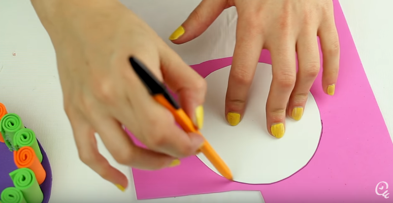 - En primer lugar, copiamos la forma de un CD en la goma eva. Para seguir recortamos los dos trozos y los pegamos al CD.- En segundo lugar, en otras dos láminas recortamos trozos con los que crearemos rollitos de goma eva que pegaremos a la base.