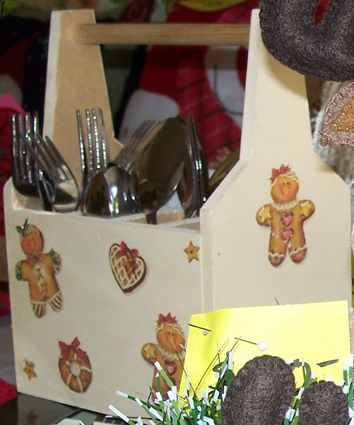 Por acá encontramos un porta-cubiertos de maderalo pinte por fuera de color marfil con pintura acrílica yagregué detalles en decoupage, ya preparándonos parael bazar navideño.