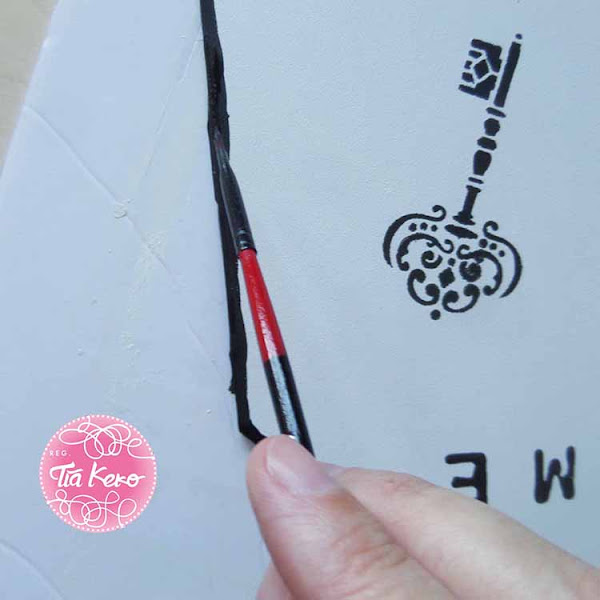Después, con los sellos de letras hicimos la palabra "home" en lo alto del colgador. Todo lo hicimos con el color negro para contrastar estos dos colores, que a nosotras nos gusta mucho.