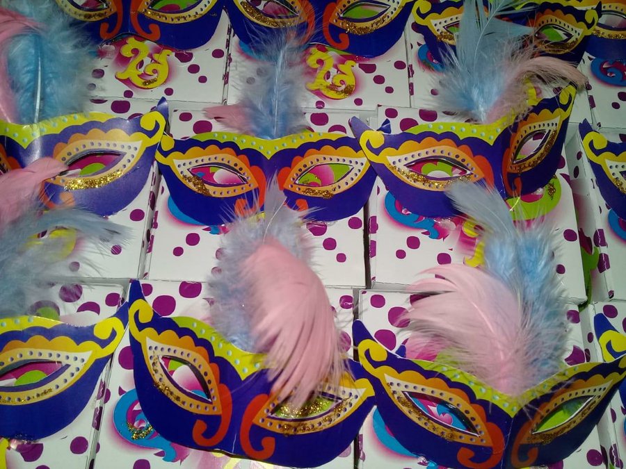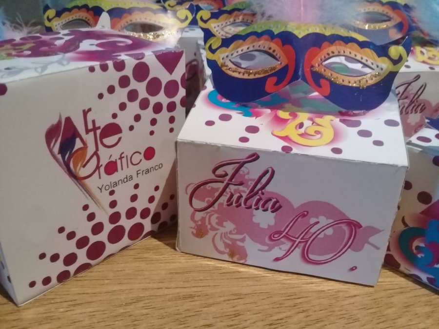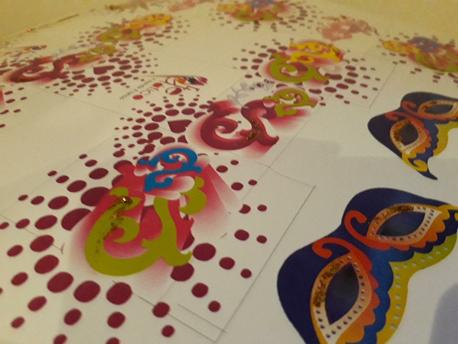 Primero realicé el patrón con un programa editor de diseño gráfico. Dibujé los antifaz. Para que sea mas original, creé un estampado multicolor. Que van a estar decorando la caja de la tarjeta. Una vez realizado el diseño lo imprimís y lo recortáis para poder armarlo.