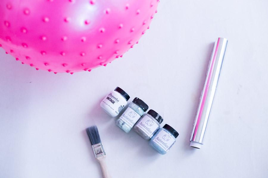Materiales: Una pelota grande (yo compré esas que tienen cuernos que sirven para saltar), papel de aluminio, cinta de carrocero, tijeras, brocha, pintura chalk paint de diferentes colores.