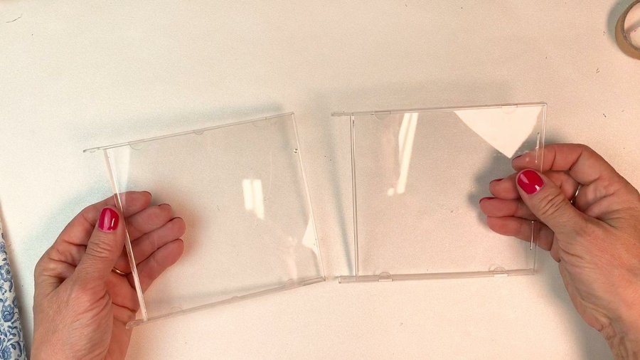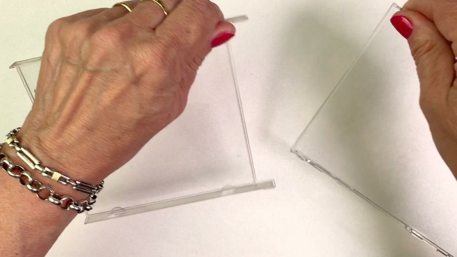 Las vamos a separar y yo decidí utilizar solo una de ellas, la que tiene la parte de la bisagra que se la corto con la mano ya que es muy frágil, y elijo ésta pieza porque es cuadrada a diferencia de la otra que es rectangular y además porque posee orificios en 2 de sus extremos que los voy a utilizar para pasar la cinta para sujetarlos.