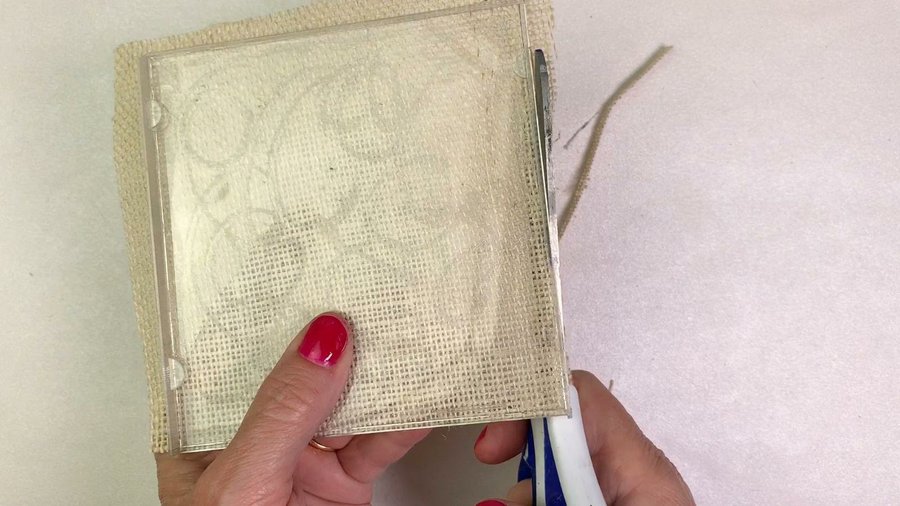 Tengo otro cartón al que le pegue la tela de yute pero con pegamento de silicona y le marqué un círculo y ahora que está seco lo recorto. Recuerden lo importante de pegar bien los bordes.