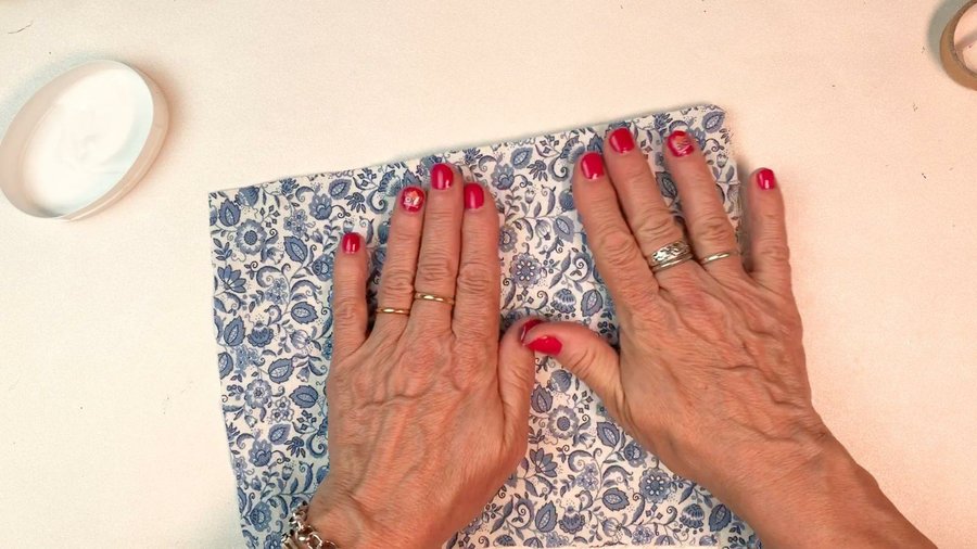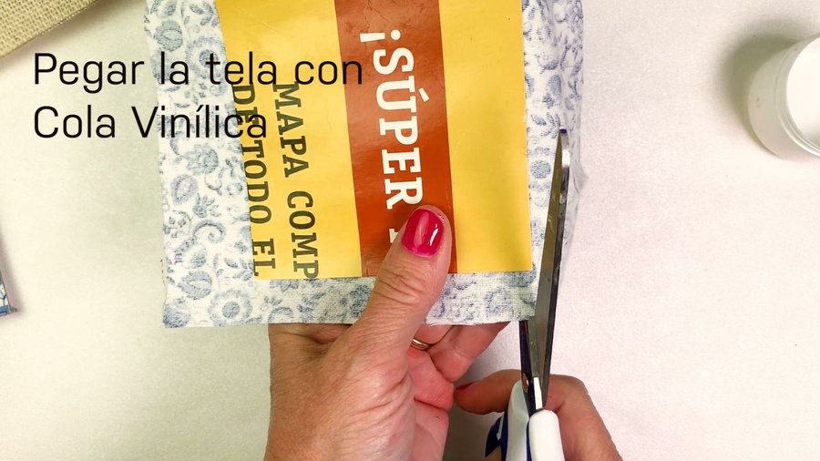 Utilizo una tela estampada de algodón, para pegarla utilizo cola vinílica muy bien aplicada sobre toda la tapa, primero en los bordes luego en el centro.